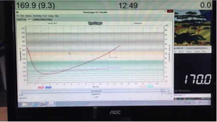 La imagen de arriba muestra un tueste realizado con granos de Café Monteverde, vemos como la linea roja oscura del tueste en proceso se va sobreponiendo con gran precisión sobre la linea rosada del perfil de tueste, puede verse que el grano ya ha iniciado el primer crack y se aproxima el final del proceso de tueste, esta etapa requiere mayor concentración por parte del maestro tostador, aqui se definen las características del aroma, el cuerpo y la manifestación de los atributos que tendrá la bebida en la taza.